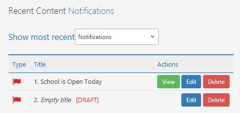 In SiteGovern, go to Recent Contents and choose the content type (shown on the right) from the dropdown.Select Notification and then, from the list of recent notifications, delete the one you would like to remove: