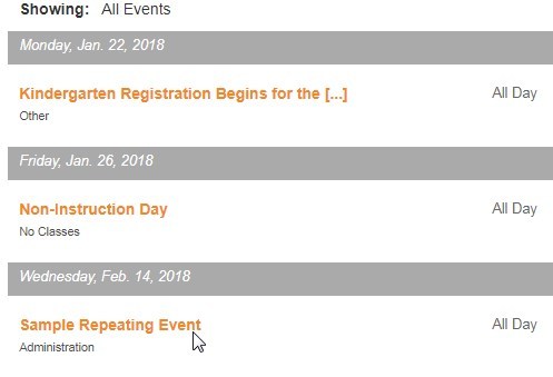 Some common, system-wide events (e.g. Spring Break dates) have been created in a central events list. These events are identified as "system-wide" in their description, as well as indicating which calendar (traditional or modified) they apply to. You're not able to edit these events - if you need a change to an event like this (that includes "system-wide" in the description and does not show the gear icon), please let us know at School Web Support: