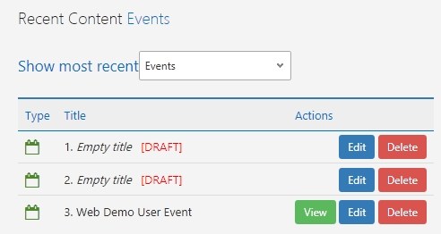 In SiteGovern, go to Recent Contents and choose the content type (shown on the right) from the dropdown. Then, in your list of recent events, choose to edit the on that you'd like to work on: