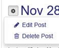 Navigate to the post in edit/secure mode (i.e. home page or News Centre) then click on gear icon and choose Edit Post.