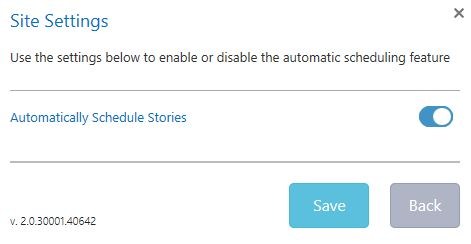 In the site settings dialog that pops up, toggle Automatically Schedule Stories on or off as needed, then save to make your selection and return to the main Scheduler window:
