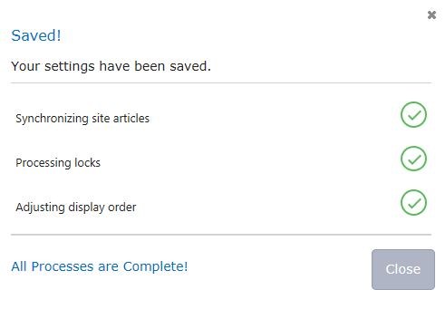 After you change your Scheduler settings, add or remove stories or QuickLinks, or re-order any of your home page items, you need to click Save at the bottom of the Scheduler for your changes to be saved and reflected in the site. When you click Save, you'll see this: